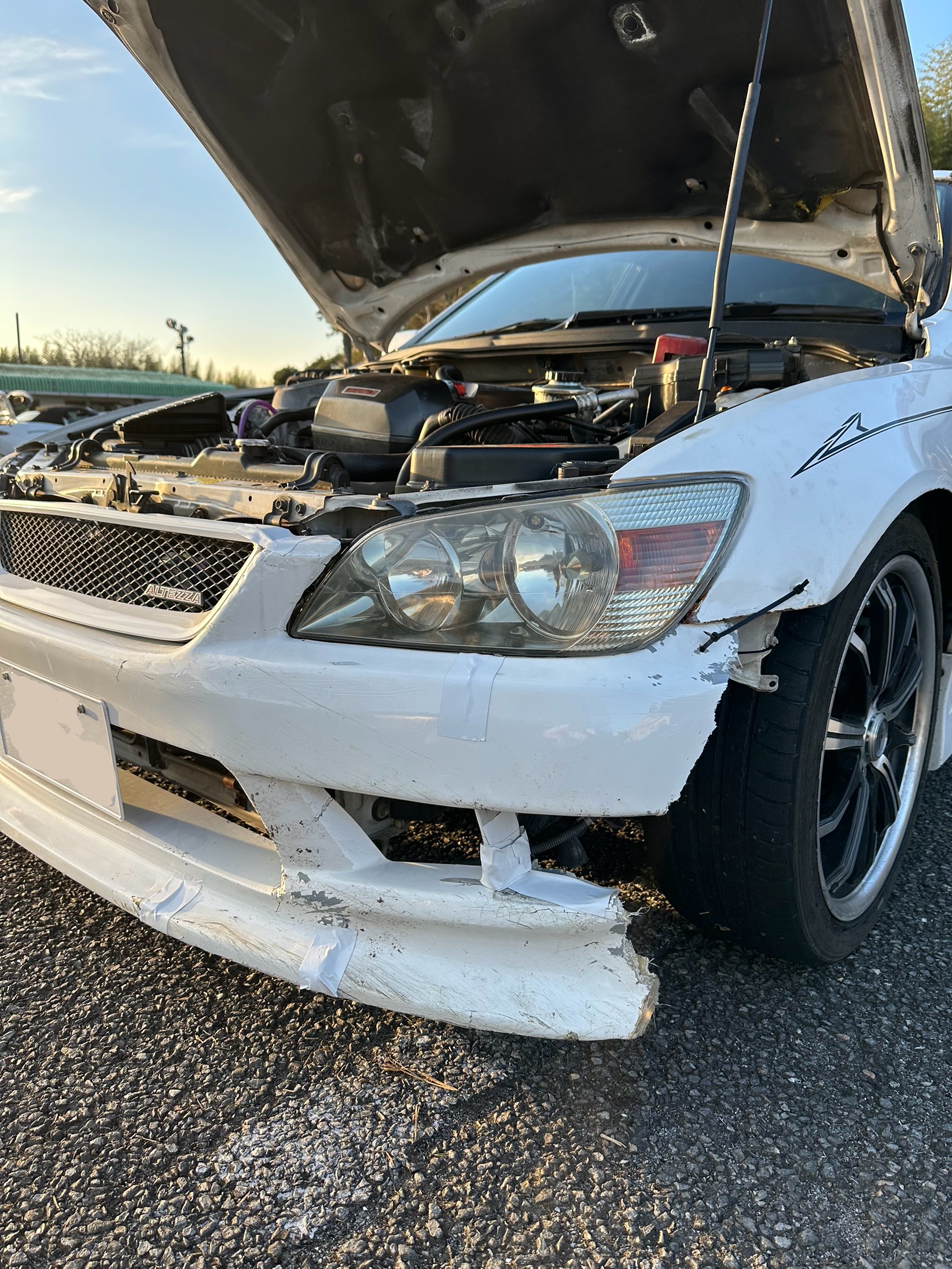 浅間台での初練習、友達にバンパーがやられました、、右側のフォグライトの行方は不明です。