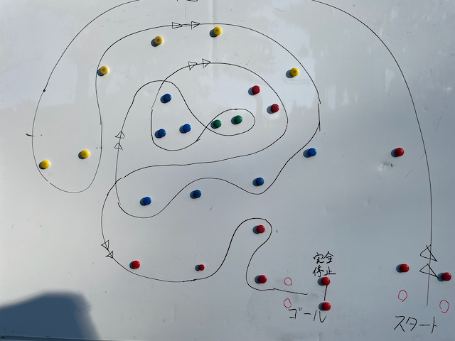 今年度のコースは、なるべくシンプルでミスコースしにくいコースにしようという意図のもと弊部ダートラ担当の佐伯によって設計されたコースで、そこまで複雑なコースではなかったかなと思います。ところが、第一ヒートでは複数台のミスコースが出てしまったほか、コース設計者の佐伯自身がミスコースをするというまさかの展開、、、来年度はもっと覚えやすいコースの方がいいかもしれませんねー