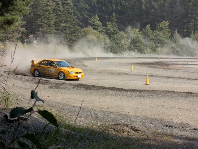 準備をしているうちに徐々に空も明るみはじめ、エントラントの方々も来場する時間となりました。昨年度は濃霧の中のダートラで午後一本勝負となってしまったこともあり、やや懸念していた天候ですが、今年度はカラッとした晴天となりむしろ砂埃がすさまじい展開となっていきます。砂埃を抑えるために散水の回数も多く、こちらも別の部会の先輩が散水車を運転してくださりました。