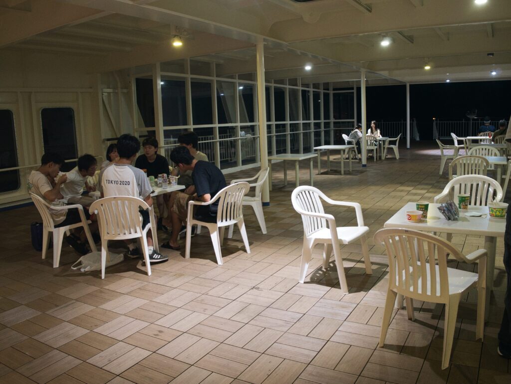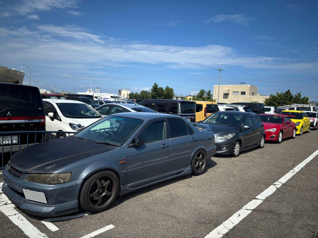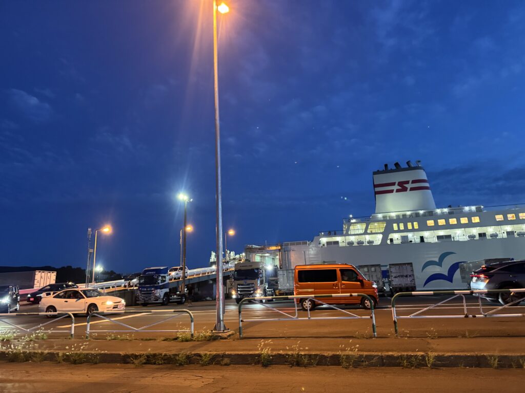 シャブ員御用達快活CLUBで一泊したのちフェリーに乗ります。車高が低そうな車は緩傾斜のスロープを使うために別ルート対応となるので、図らずも車高の低いシャブカーたちが集められてしまいました(フェリー会社様お手数をおかけしました)。なぜか筆者の車はジムカ車なのに一般車の列に案内されました(退部案件)。