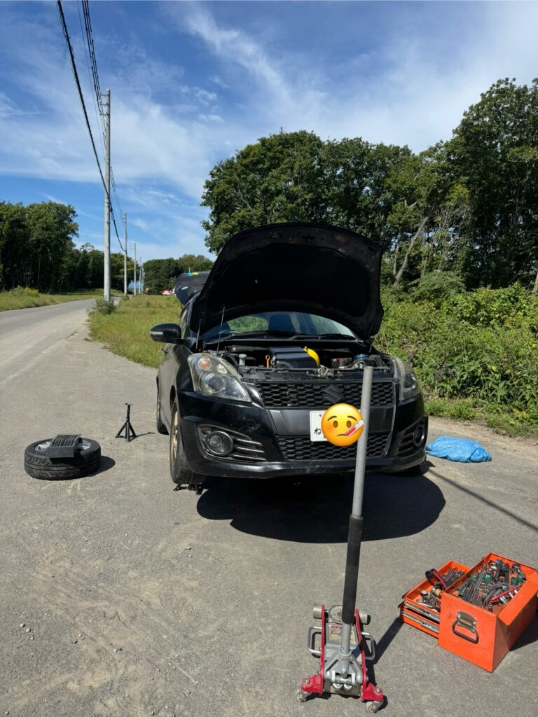 開会式の後、各大学で二次会に行き、東大も例に漏れずカラオケに行っているようでしたが筆者は北大ガレージに向かいました。開会式の時、北大自動車部様にハブボルトのヘルプをお願いして、手伝っていただきました。この場を借りて御礼申し上げます。偶然同じ出身市・高校の先輩に出会いながら、とにかく炙る、ラスペネ噴射、そしてPOWERでかまします。緩みました!!!本当にありがとうございました。拙文ながら感動いたしました。ようやく次に進めると思い潜ってみると仰天。インターミディエイトシャフトがブチギレていました。ジョイントとかではなく、棒の部分が二つに分かたれ、右輪に動力が伝わらない状態でした。ということは新千歳から札幌まで一輪駆動で移動していたことになります。バイクですか?ともかく、あとはインタミを車体に固定するボルトを緩めて引っこ抜くだけなのですが、緩まない。んーなんで????ありえないくらい固い。さらに悪いことに、排気系の取り回し、メンバー、ボディが絶妙にスピンナーがガゴンがゴンガンがガンでありました🪦💀(死亡)。車の下で寝転がってクネクネしているだけで時間が過ぎていきます。どうしようもなく、お邪魔させていただいている身で誠に恐縮ながら北大自動車部様のお力をお借りさせていただきました。主管でお忙しい中、また夜遅いなか本当にありがとうございました。北大主将閣下ご自身の私物工具まで動員なさって外していただきました。ありがとうございました。あとは引っこ抜いて交換して元に戻すだけ。流石にもう引っかかるところはありませんでしたが、筆者は愚鈍なのでかなり時間がかかってしまいました。全部終わった頃には周りが明るくなっておりました。筆者が長時間占領したため、北大自動車部様には大変遅い時間までガレージに駐在していただいてしまい、申し訳ありませんでした。